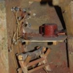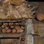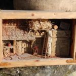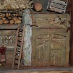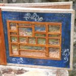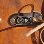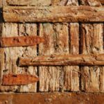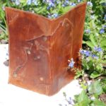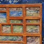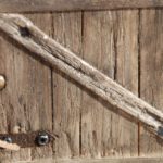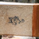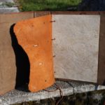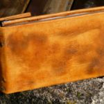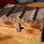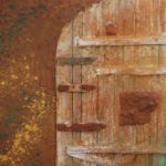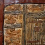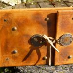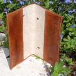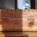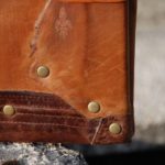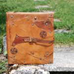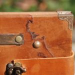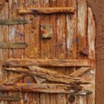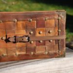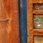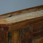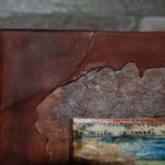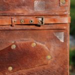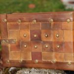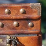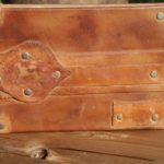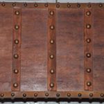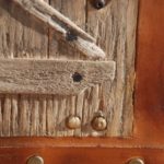 4 renforts d'angle en cuir, clous patinés vieillis, décor "vieille porte de cave usée par le temps".