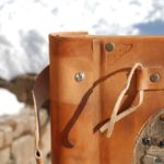 Système de fermeture par sangle en cuir et boucle patinée. 2 renforts d'angle en métal vieilli. Les 2 premières pages intérieures papier style "parchemin".