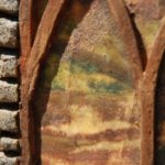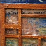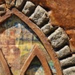 Couverture carton patiné marron, déco 'Fenêtre moyen-âge' encadrement rouillé et rendu granite. Photo antique en fond.