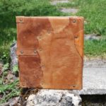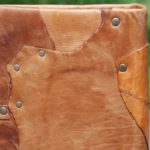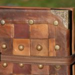 Carnet livre d'or aspect vieux grimoire en cuirs marrons vieillis style "patchwork", rivets patinés.