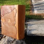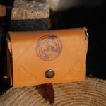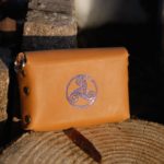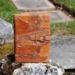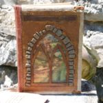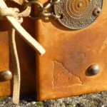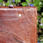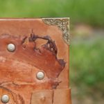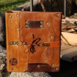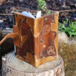 Carnet livre d'or cuir marron aspect vieux grimoire en cuir, avec motifs celtiques et arabesques.