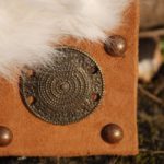 Couverture avec fourrure véritable, au toucher soyeux, motif bouclier antique et clous vieillis.