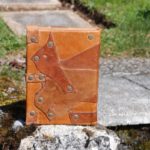 Carnet cuir marron aspect vieux grimoire vieilli en cuir, avec clous patinés, empreintes celtiques.