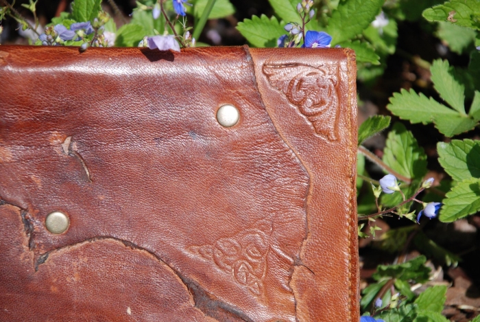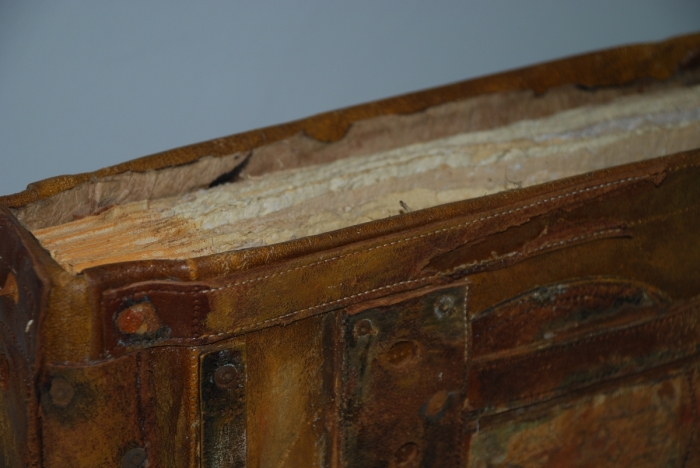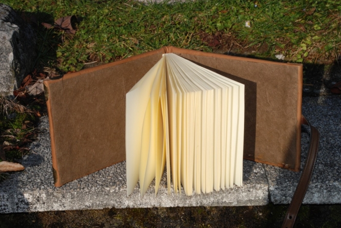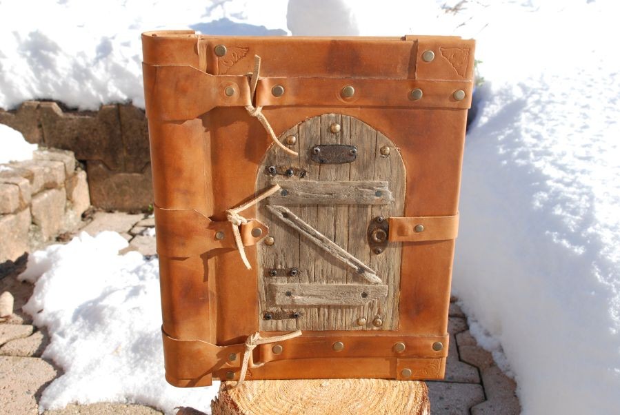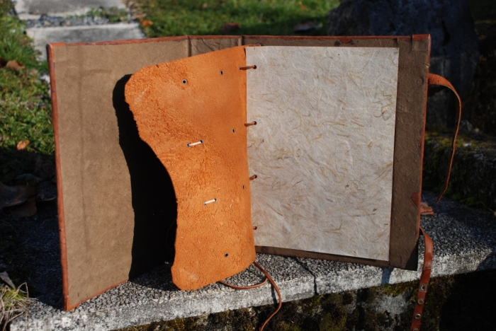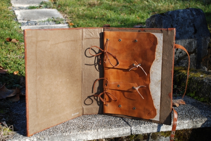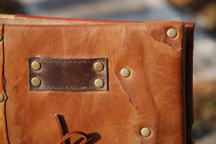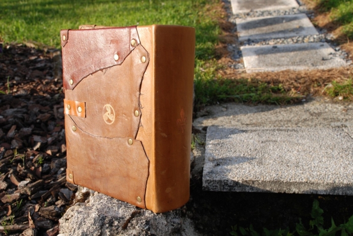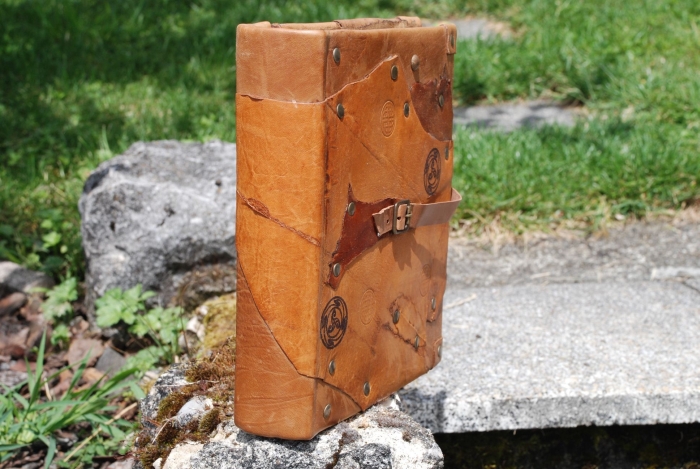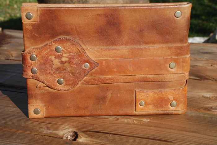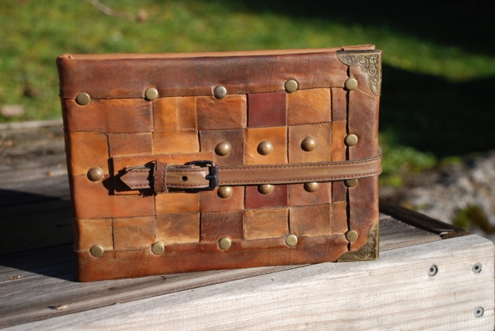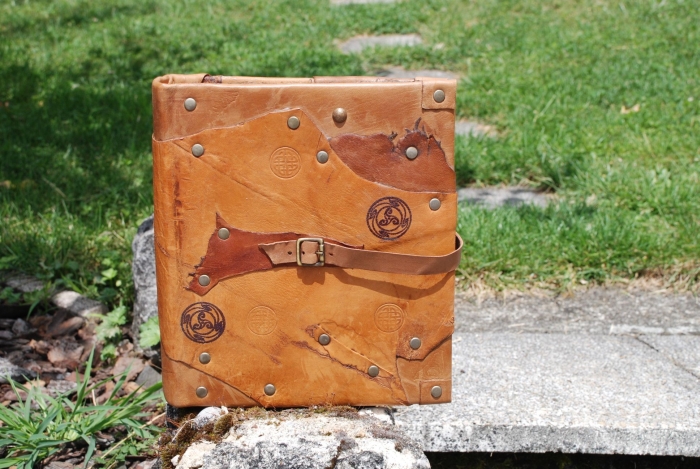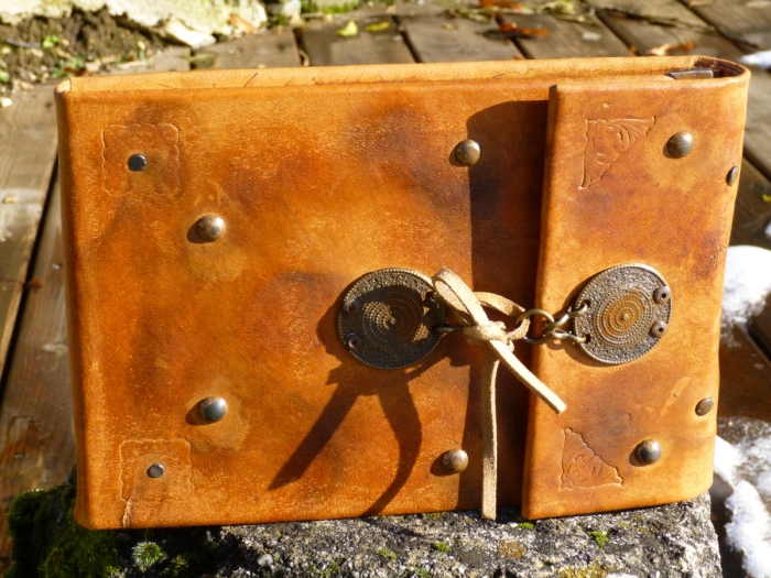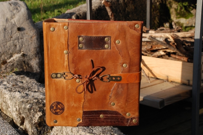 Album ancien « celtique » divers cuirs vieillis et papier imitation parchemin en 1ères pages intérieures, avec empreintes celtiques et clous patinés.