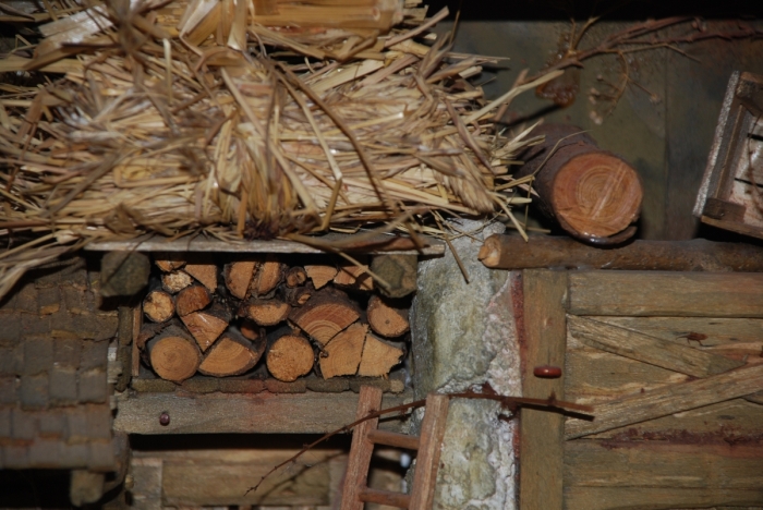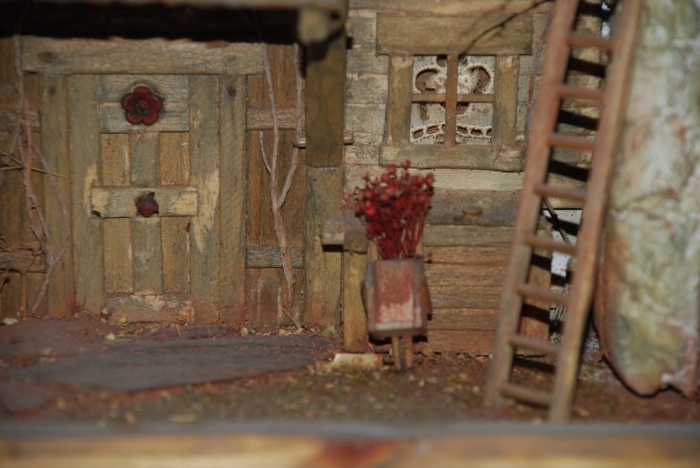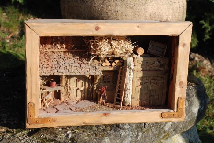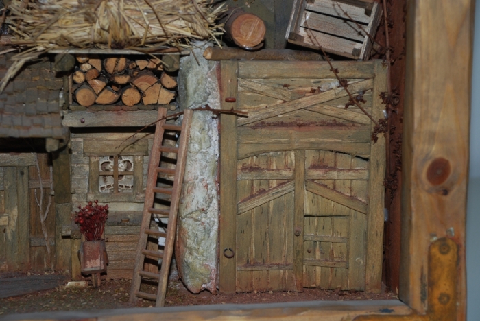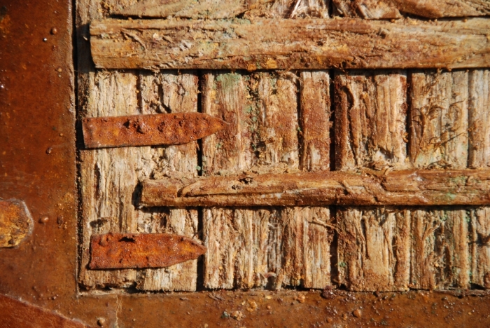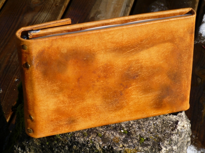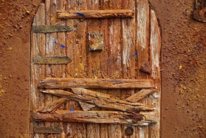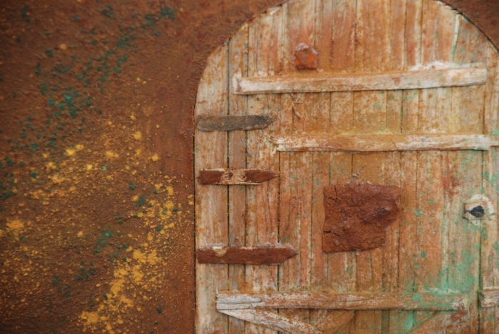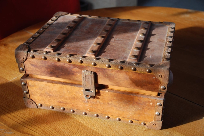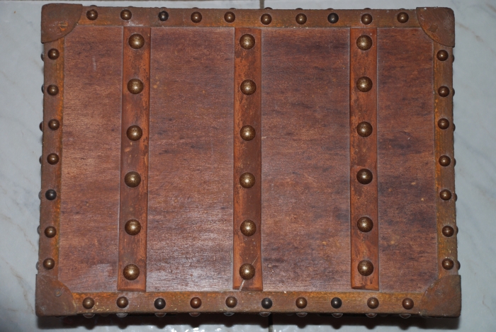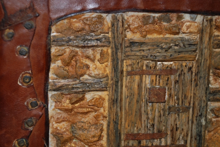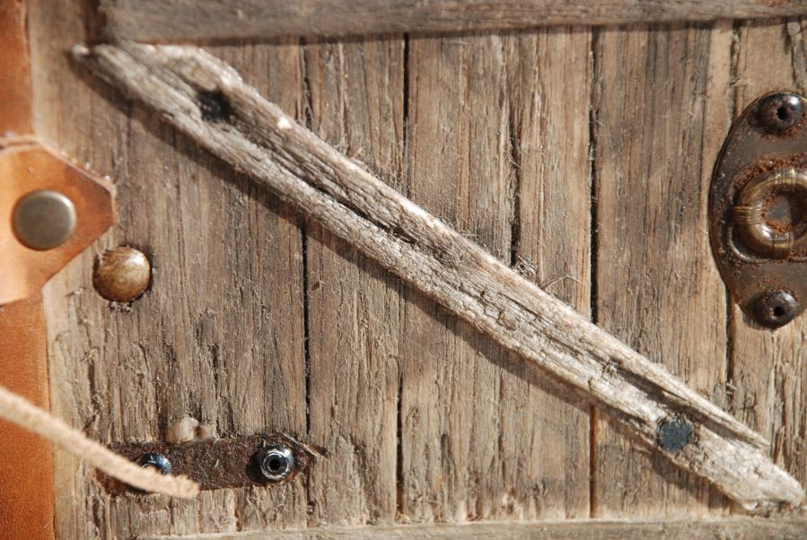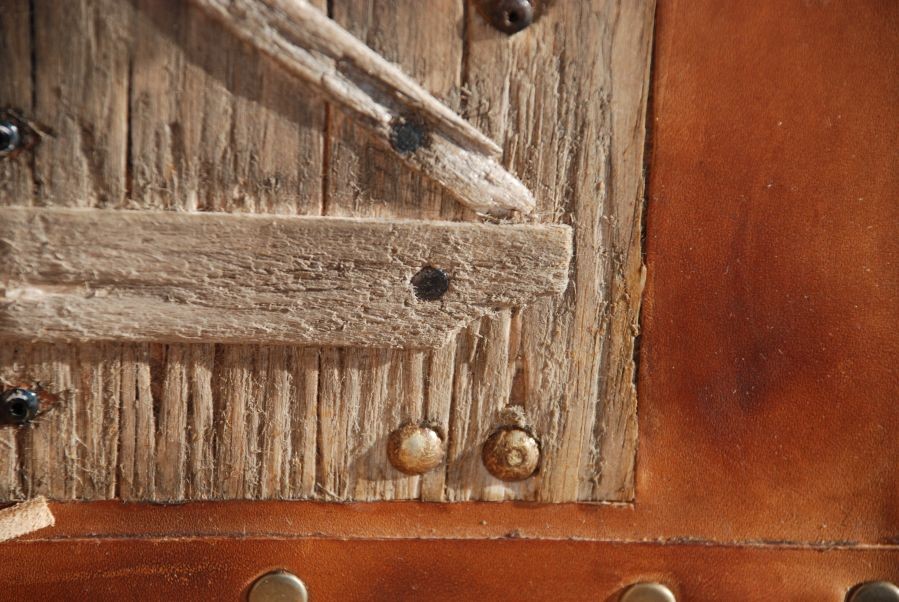4 renforts d'angle en cuir, clous patinés vieillis, décor "vieille porte de cave usée par le temps".