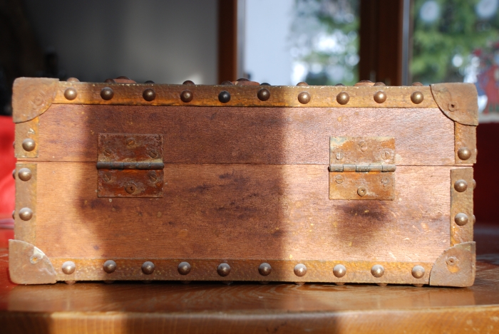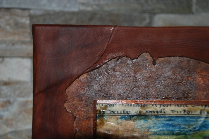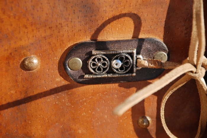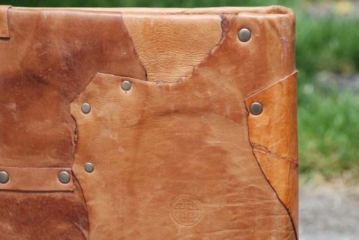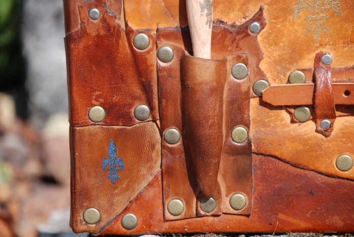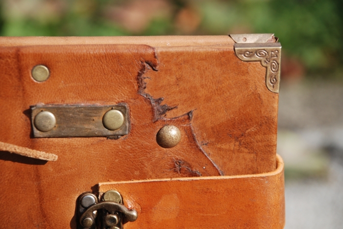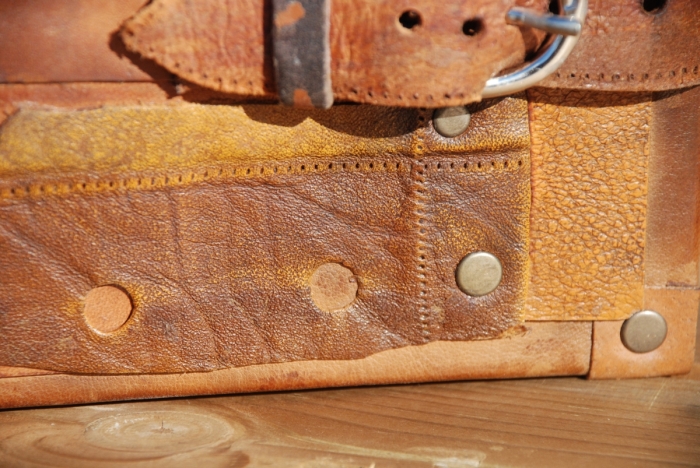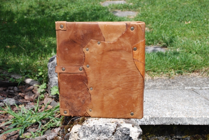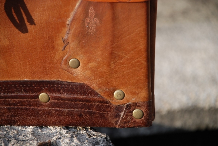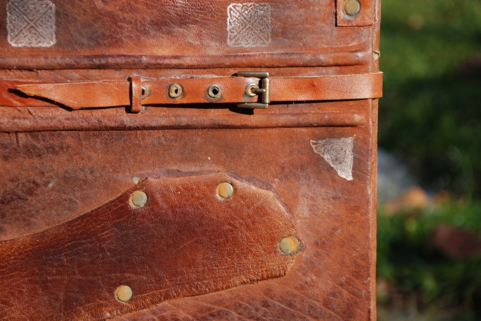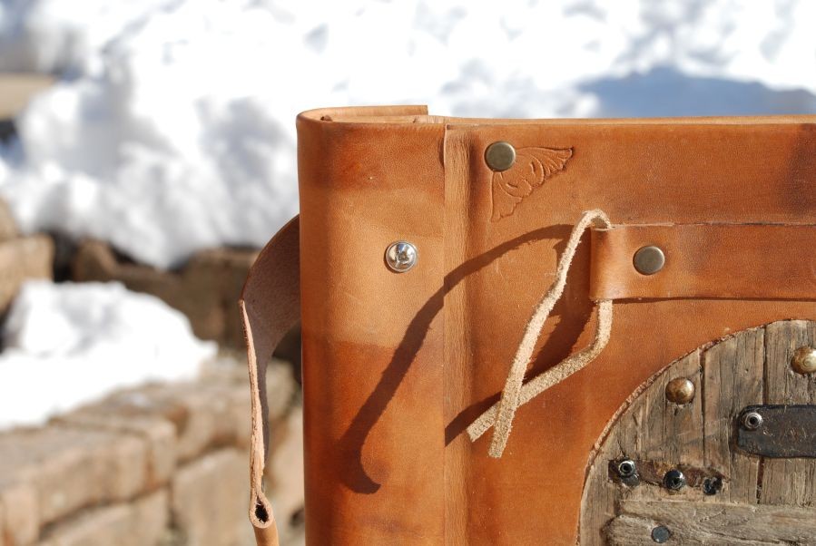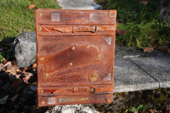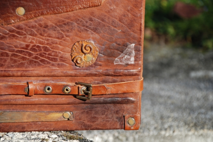 Fermeture par boucles patinées et liens de cuir.4 renforts d'angle en cuir.