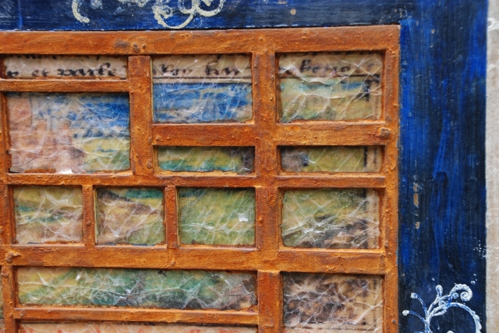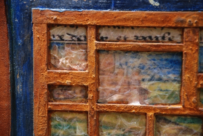 Album photo d'inspiration médiévale. Décoration antique avec photo vieillie évocation moyen-âge, cadre multi-fenêtres oxydé et rouillé. Fond patiné bleu nuit.