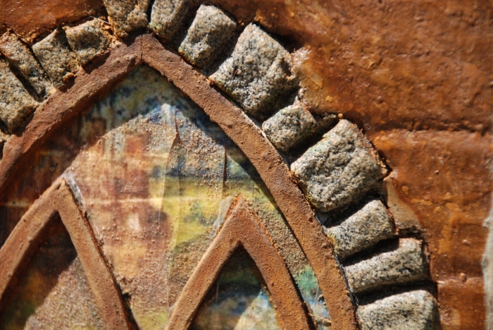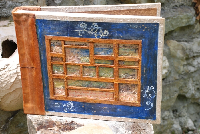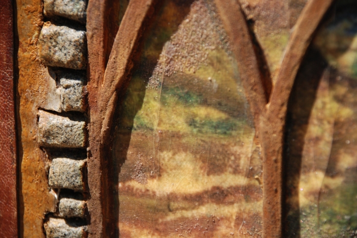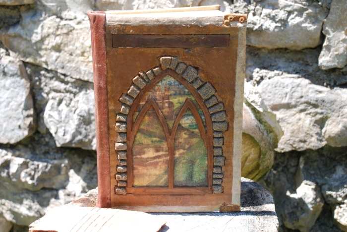 Couverture carton patiné marron, déco 'Fenêtre moyen-âge' encadrement rouillé et rendu granite. Photo antique en fond.