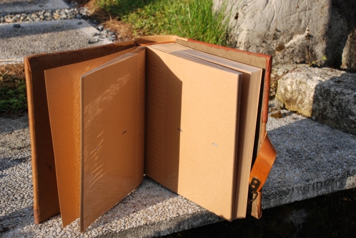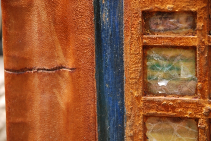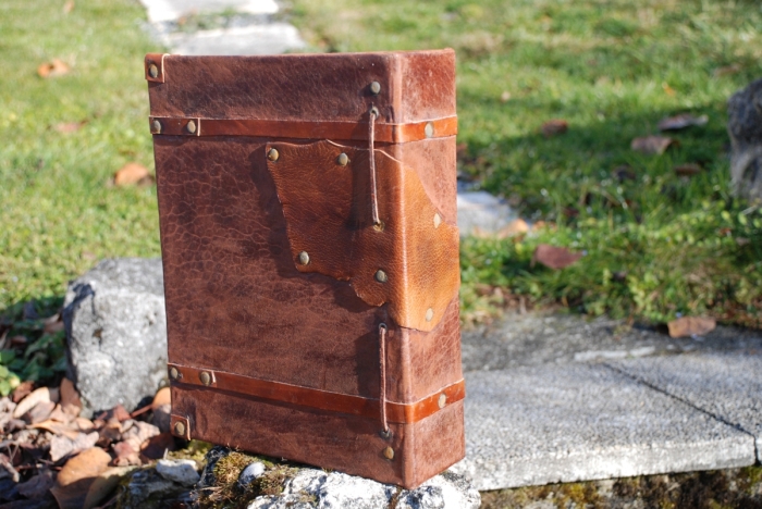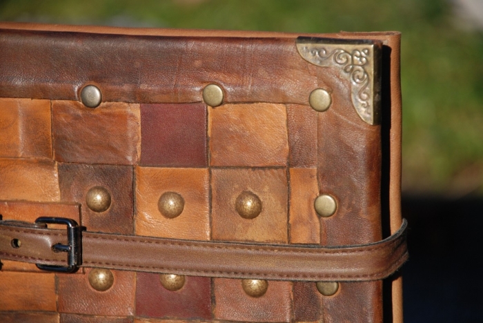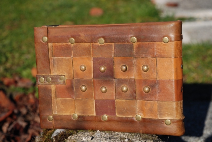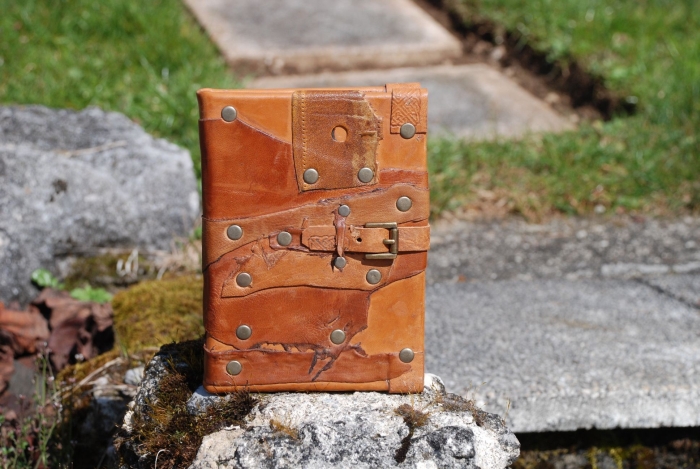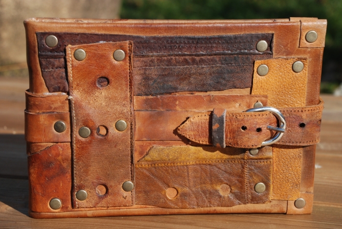 Carnet livre d'or aspect vieux grimoire en cuirs marrons vieillis style "patchwork", rivets patinés.
