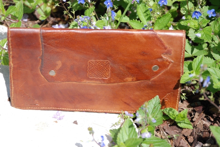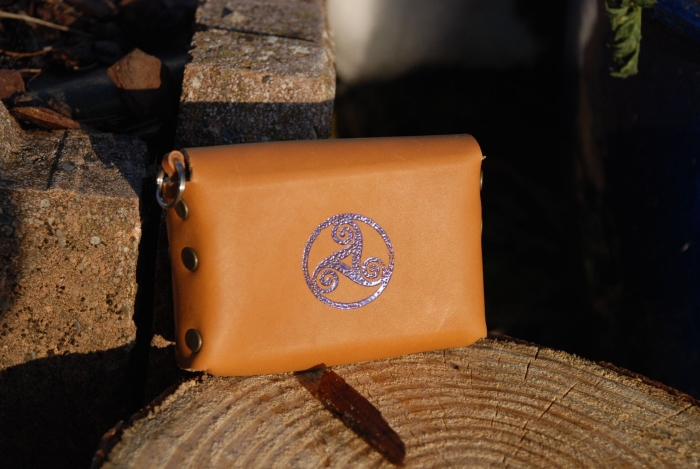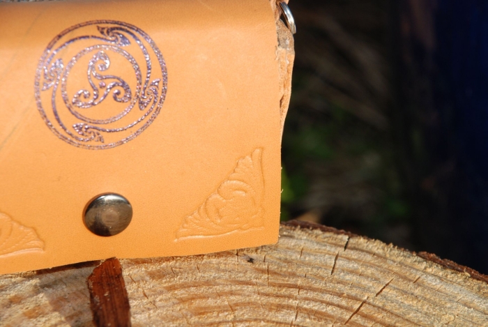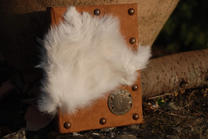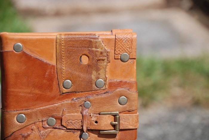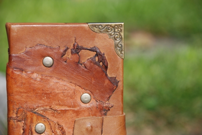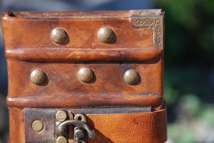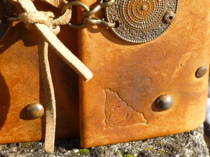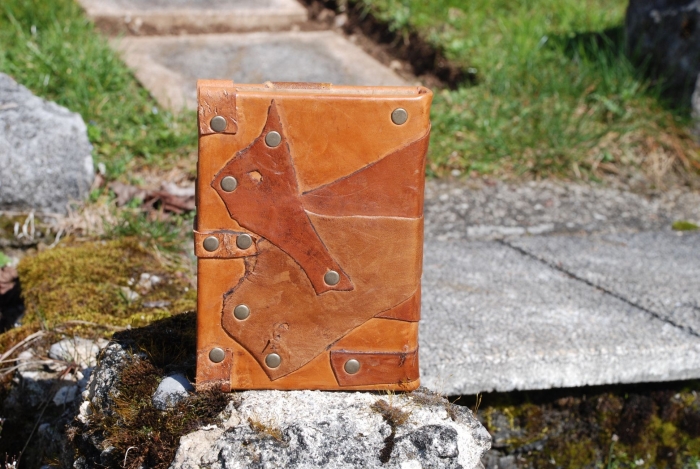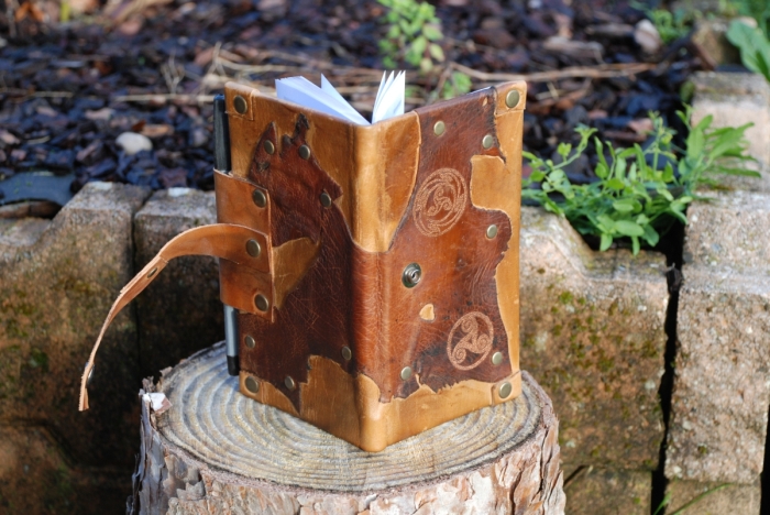 Carnet cuir marron aspect vieux grimoire vieilli en cuir, avec clous patinés, empreintes celtiques.