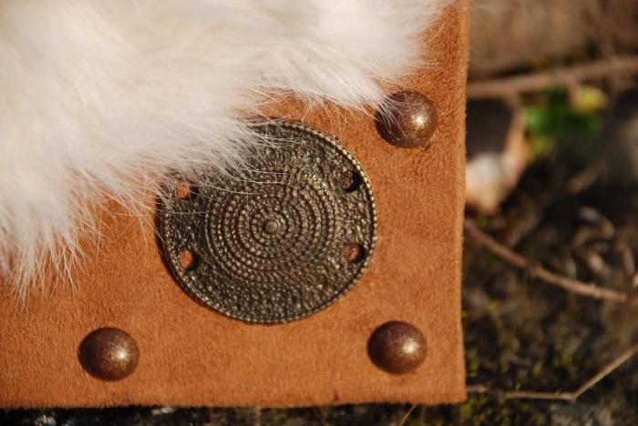 Couverture avec fourrure véritable, au toucher soyeux, motif bouclier antique et clous vieillis.