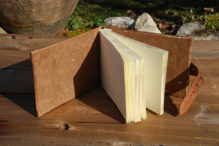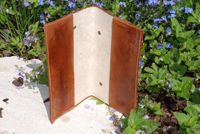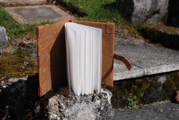 Carnet recouvert tissu imitation cuir peau couleur marron clair.