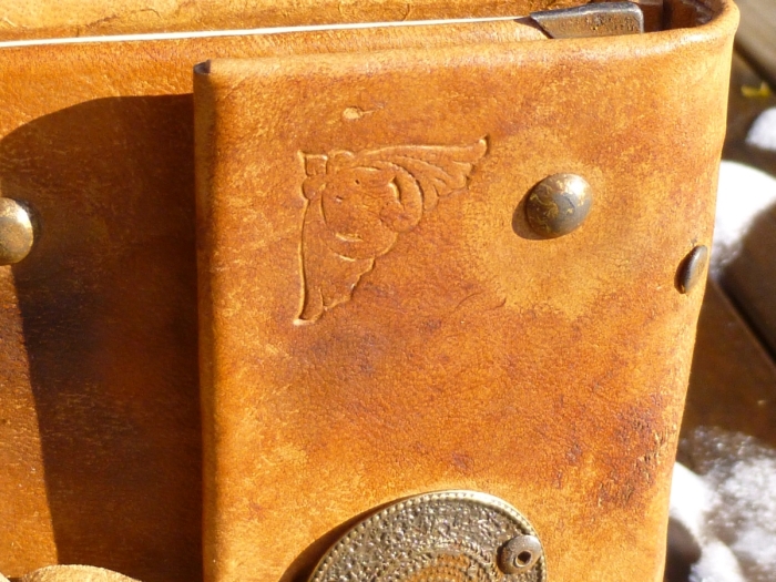 Système de fermeture par sangle en cuir et boucle patinée. 2 renforts d'angle en métal vieilli. Les 2 premières pages intérieures papier style "parchemin".