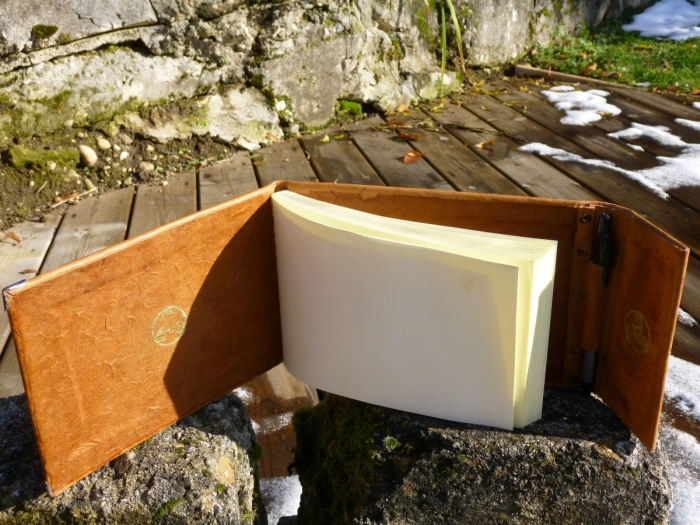 Stylo intégré à l'intérieur. 1ère page intérieure style "parchemin".