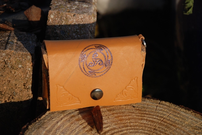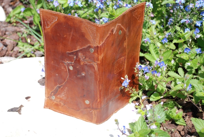 Carnet livre d'or cuir marron aspect vieux grimoire en cuir, avec motifs celtiques et arabesques.