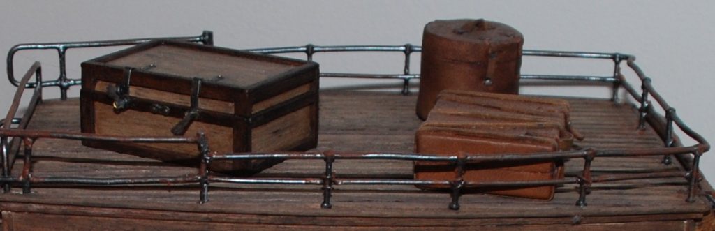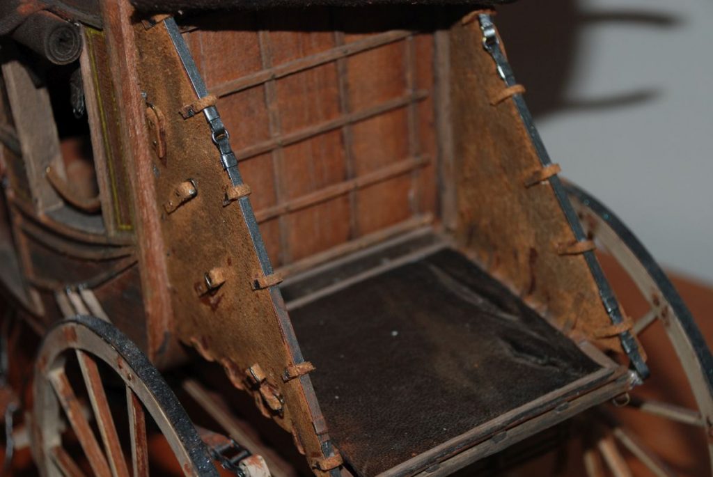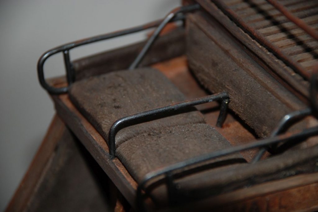 Pour cette maquette, je suis partie sur la base d’une maquette en bois à construire ; et puis j’ai mis ma touche personnelle : j’ai remplacé le simili cuir par du vrai cuir que j’ai usé… pour les sièges :